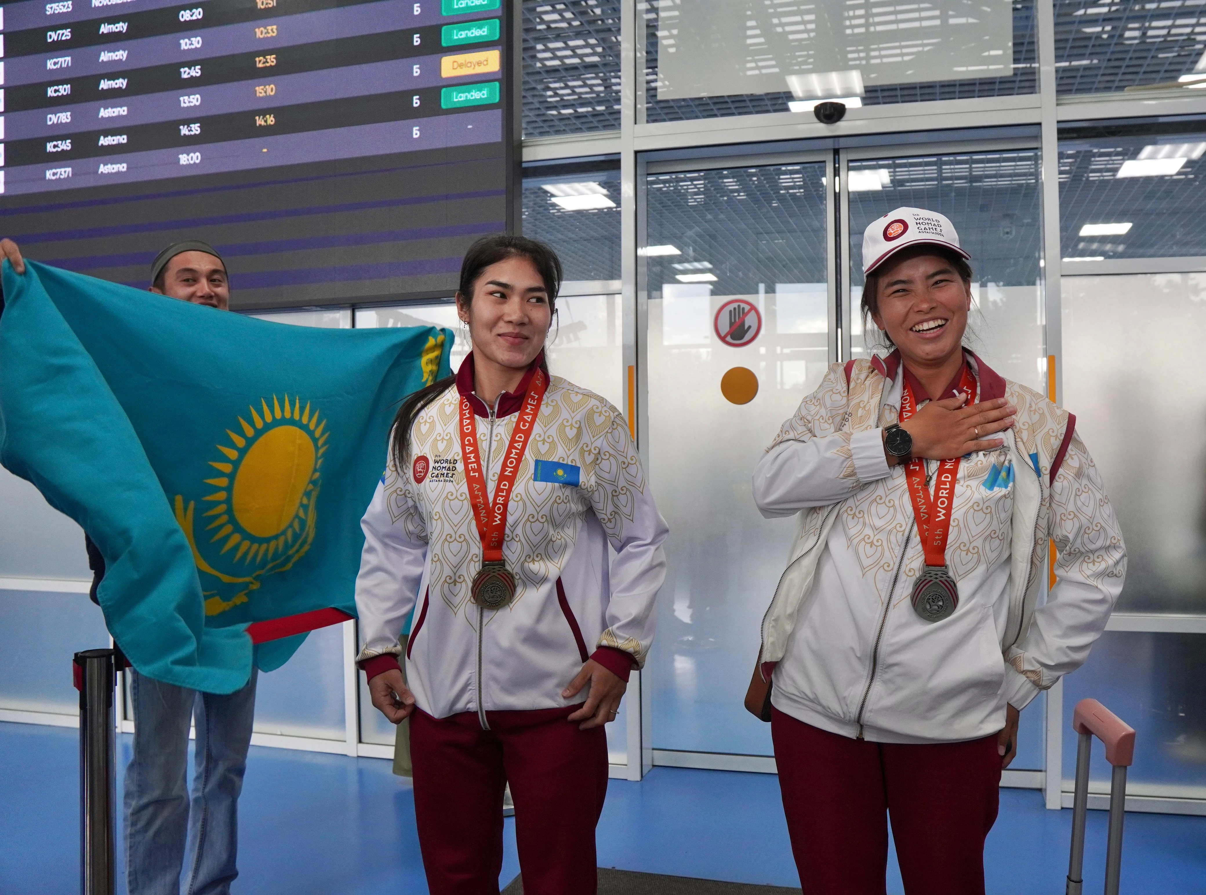 Сегодня в аэропорту областного центра Восточно-Казахстанской области, чествовали спортсменок, завоевавших призовые места на своего рода олимпиаде по традиционным для кочевников видам спорта. С цветами, угощеньями и национальными флагами встретили серебряного призера в командном зачете по традиционной стрельбе из лука Ажар Толеуканову и бронзового призера в командном зачете по мас-рестлингу Тахмину Гожамбердиеву.