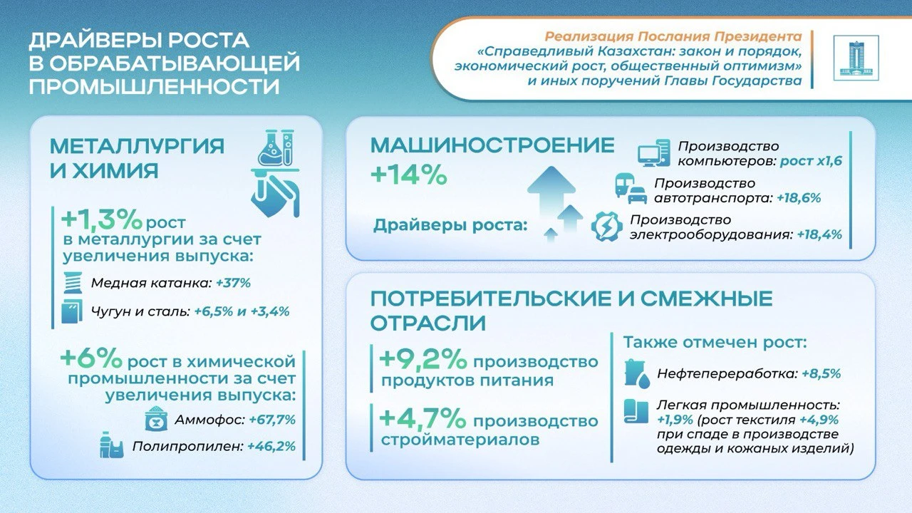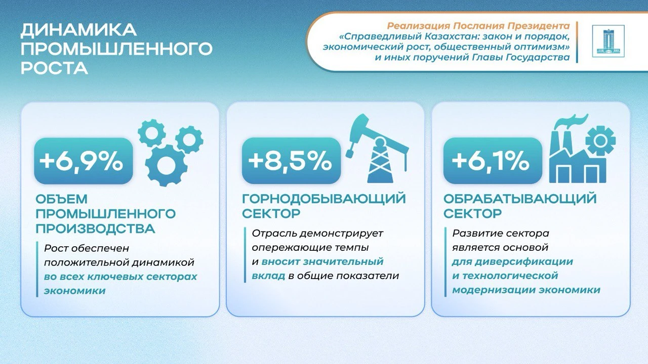 Ключевой задачей, поставленной Главой государства, является построение сильной и диверсифицированной экономики. Итоги 7 месяцев 2025 года свидетельствуют о положительной динамике в промышленном секторе, который является локомотивом национального развития. Объем промышленного производства продемонстрировал уверенный рост на 6,9%. Драйверами роста стали как горнодобывающая промышленность, увеличившая объемы на 8,5%, так и, что особенно важно для диверсификации, обрабатывающий сектор, показавший рост на 6,1%.