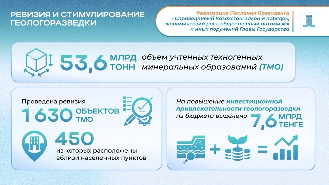 Проведена ревизия техногенных минеральных образований (ТМО), в ходе которой учтено 1 630 объектов объемом 53,6 млрд тонн. Справочно, всего в государственном фонде недр числится 1 747 объектов ТМО общей массой 55 млрд тонн, из них 450 расположены вблизи населенных пунктов, что подчеркивает важность их вовлечения в переработку. Для повышения инвестиционной привлекательности геологоразведки в 2025 году из бюджета выделено 7,6 млрд тенге на исследование 41 объекта.