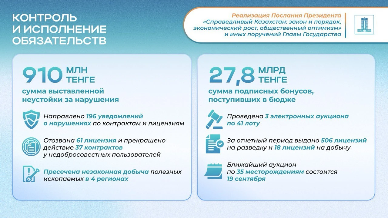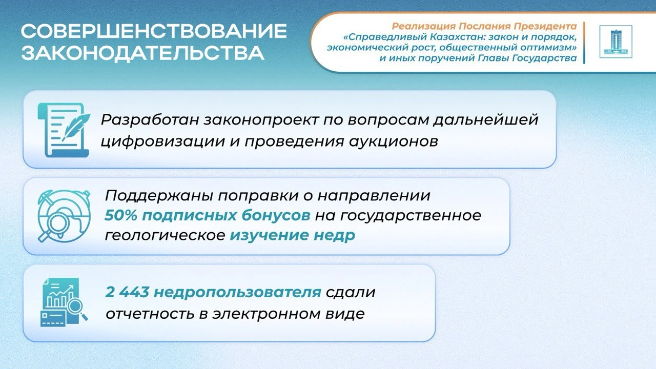 Таким образом, деятельность Правительства направлена на комплексное решение задач, поставленных Главой государства. Устойчивый рост промышленности формирует основу для экономического развития, системная работа по расширению минерально-сырьевой базы обеспечивает долгосрочную стабильность, а меры по наведению порядка в сфере недропользования укрепляют принципы справедливости и верховенства закона.