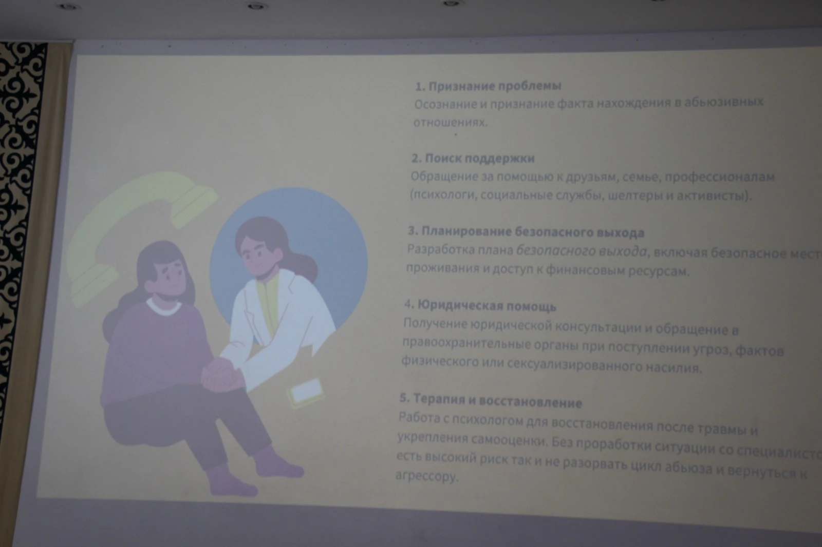 Тренинг провела Назигуль Таубакулова - магистр психологических наук, член Союза психологов Казахстана, аппликант Общества психоаналитиков Центральной Азии, семейный психолог. Она рассказала о видах бытового насилия, его психологических последствиях, а также о факторах, влияющих на самооценку и о любви к себе.