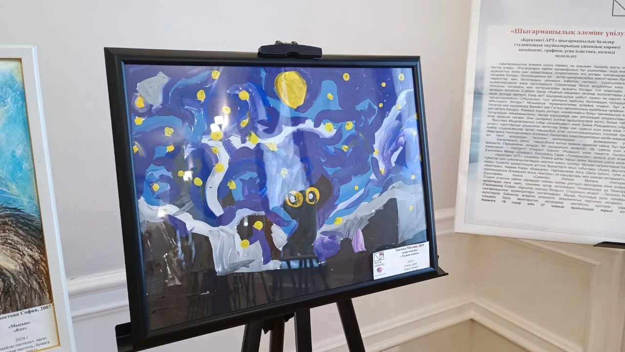 В просторном зале музея представлены работы юных художников. Среди них - сказочные иллюстрации, анималистика, пейзажи, произведения, вдохновленные наследием традиционного казахстанского искусства, а также трогательные работы, посвященные 80-летию Победы в Великой Отечественной войне. Возраст участников варьируется от младших школьников до учеников средних и старших классов. Работы выполнены в самых разных техниках: живопись, графика, мелкая пластика и объемное моделирование. Каждая из них - отражение мира глазами ребенка. Многие ребята обращаются к классике: интерпретируют знаменитые полотна, иллюстрируют литературные произведения или создают собственные яркие фантазийные миры.