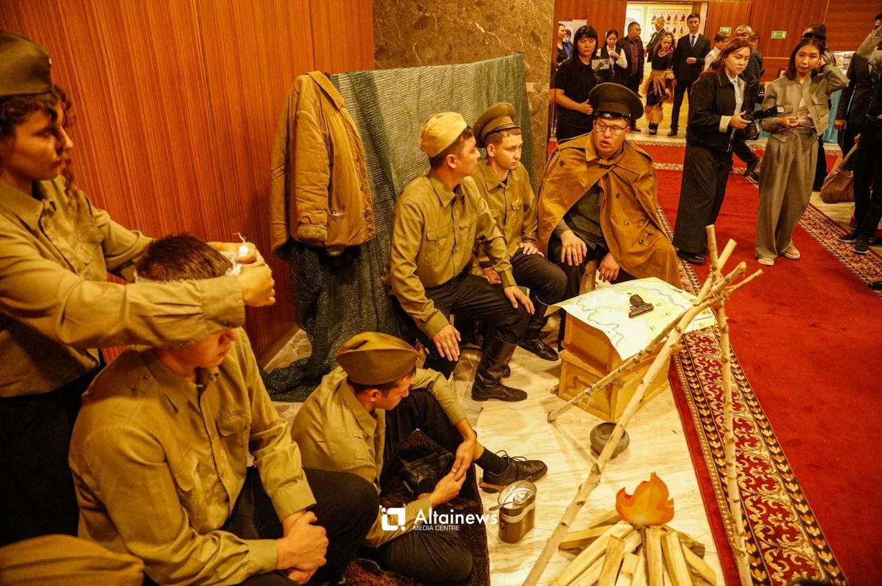 Вечер открылся этнографической композицией, изображающей аул Жидебай. На сцене были установлены юрты, артисты исполнили песни и стихи. Учащиеся разыграли сценки, посвященные военным годам, и исполнили патриотические песни.